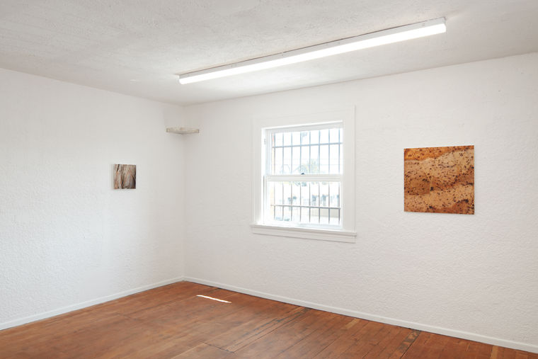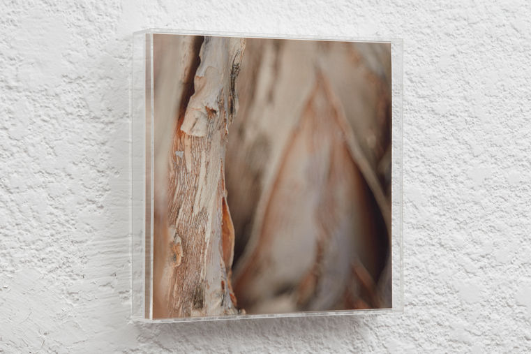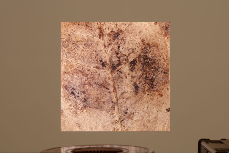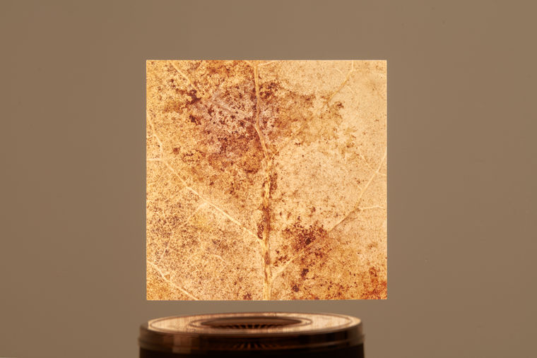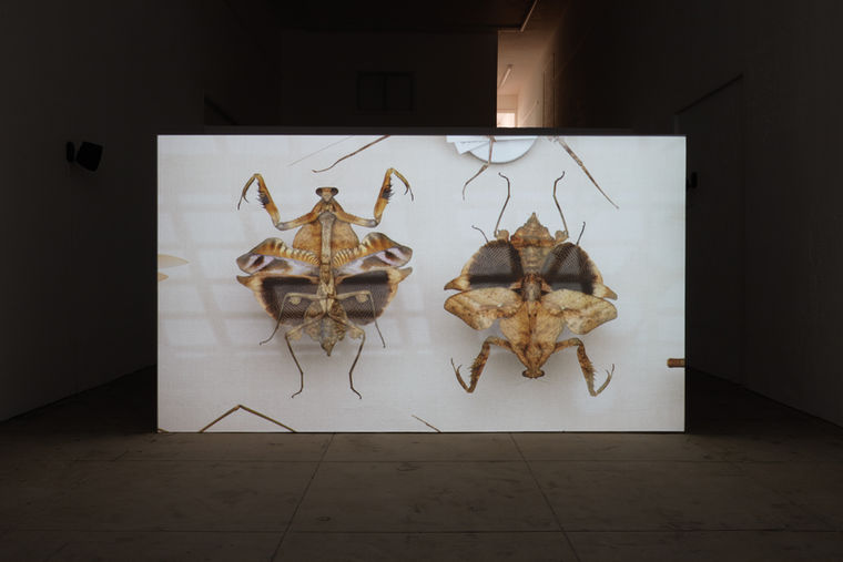 Stuker’s meticulously 3D rendered video Wet Season, Dry Season reconstructs a display case of mimetic insects at the Hope Department of Etymology inside the Museum of Natural History in Oxford, UK. Across four speakers, ambient sounds recorded at the museum by the artist surround the gallery, featuring the murmured chatter of museum visitors. In the back gallery, two Hasselblad PCP-80 slide projectors each rotate through eighty slides of digitally rendered examples of biological mimicry. In the upstairs gallery, two images from the slide series are reproduced as mounted archival pigment prints, alongside a collaborative work with Nour Mobarak. In the collaborative work, Stuker’s rendered image of a paperbark tree, placed against the interior face of a plexiglass box, slowly disintegrates as it is consumed by Mobarak’s mycelium. To the left, an unaltered example of the same image is preserved within an identical plexiglass box.